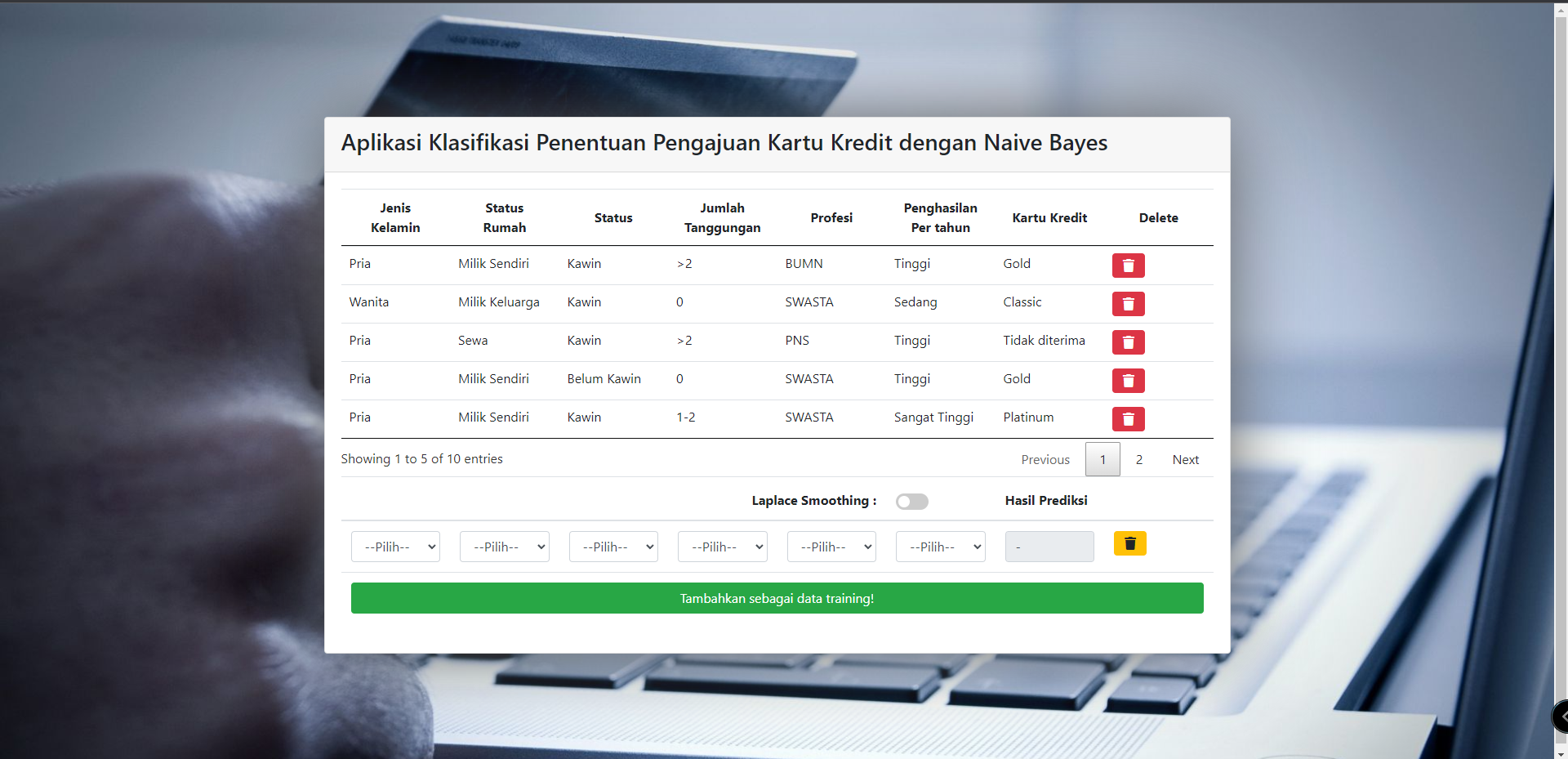 Built on native PHP and Bootstrap Framework. DSS for Credit Card approval using bayes algorithm and Laplace smoothing option.
